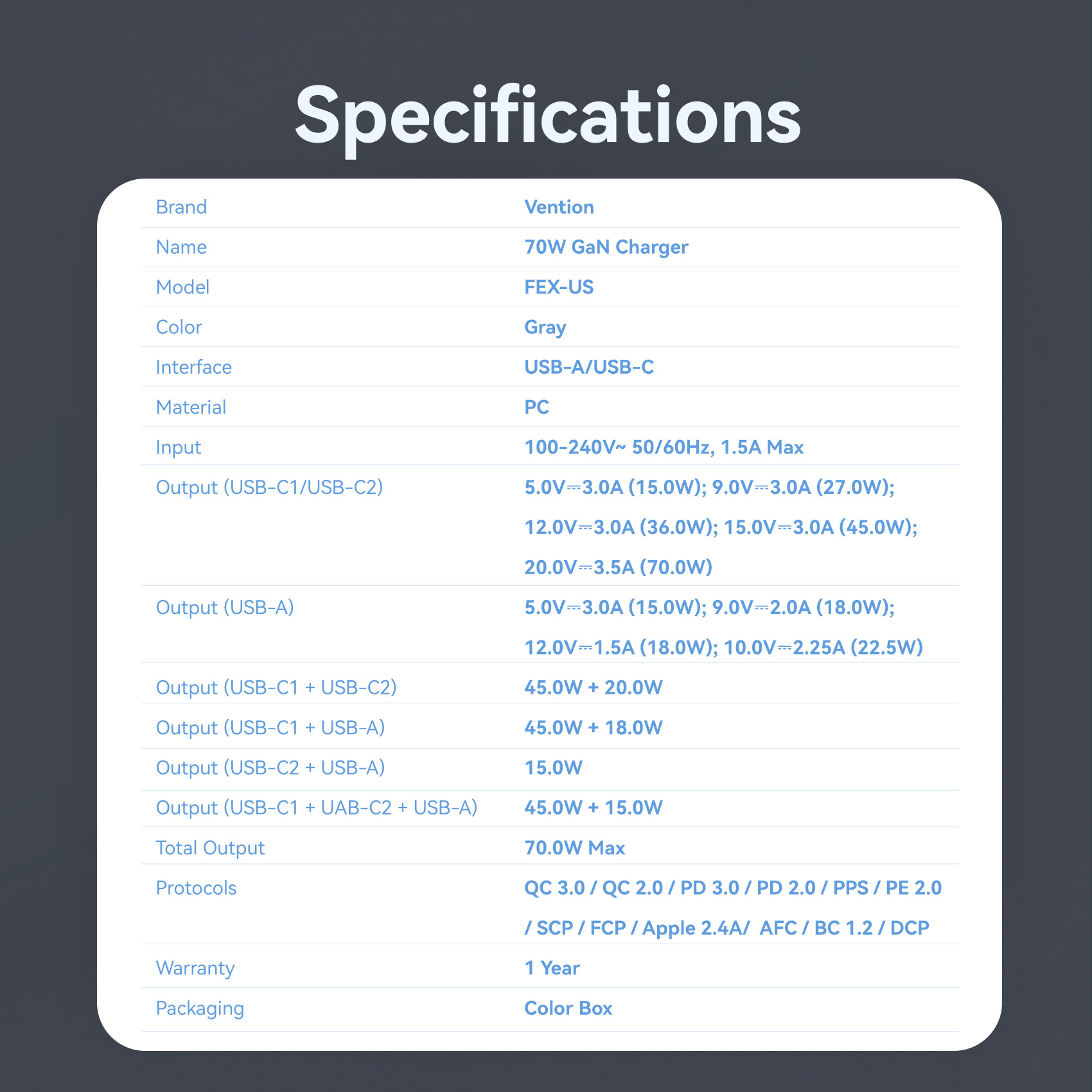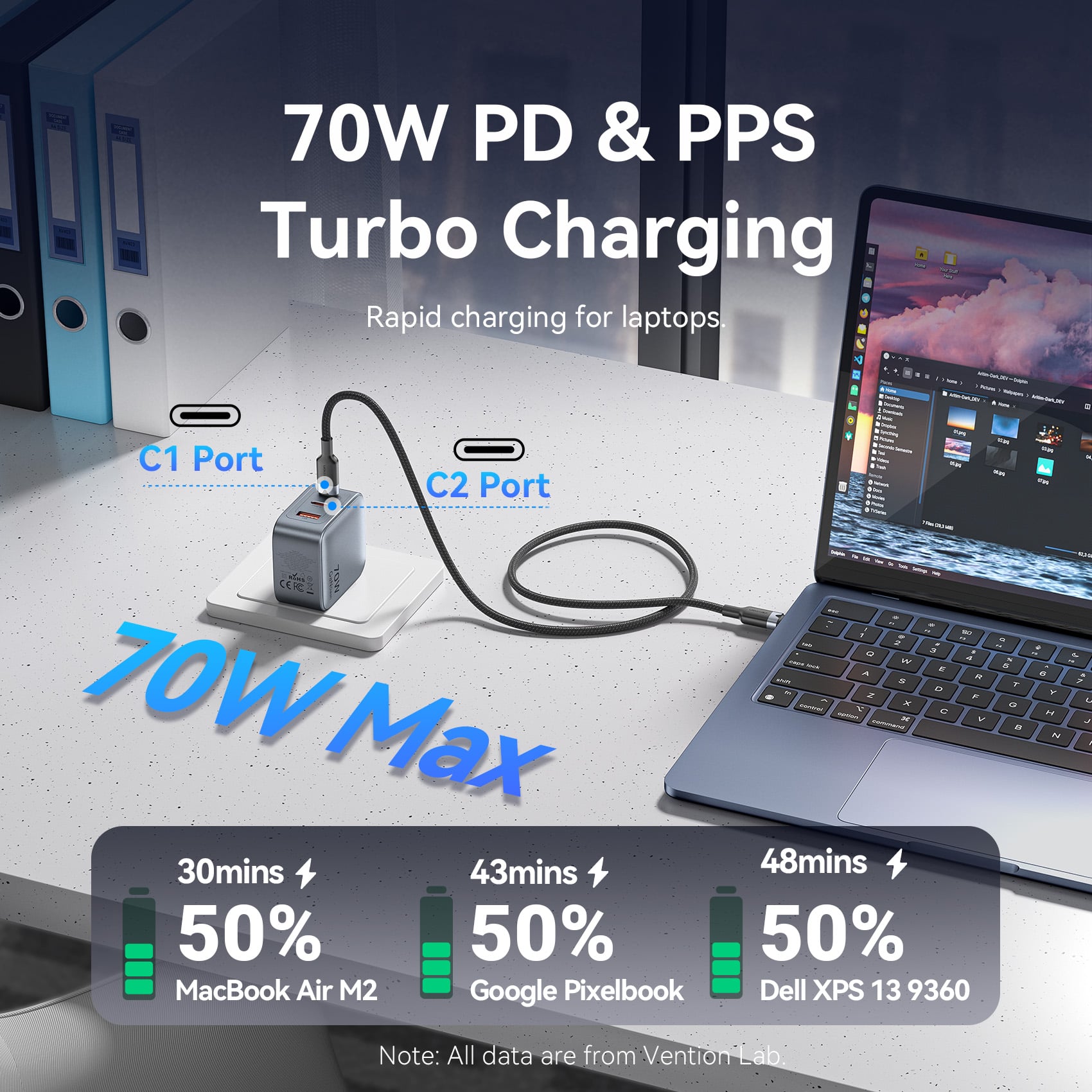 Với tổng công suất lên đến 70W, củ sạc VENTION FEX hỗ trợ sạc nhanh chuẩn Power Delivery (PD) và PPS. Điều này cho phép sạc tốc độ cao cho nhiều loại thiết bị, từ điện thoại thông minh, máy tính bảng cho đến cả các dòng laptop hỗ trợ sạc qua cổng Type-C.