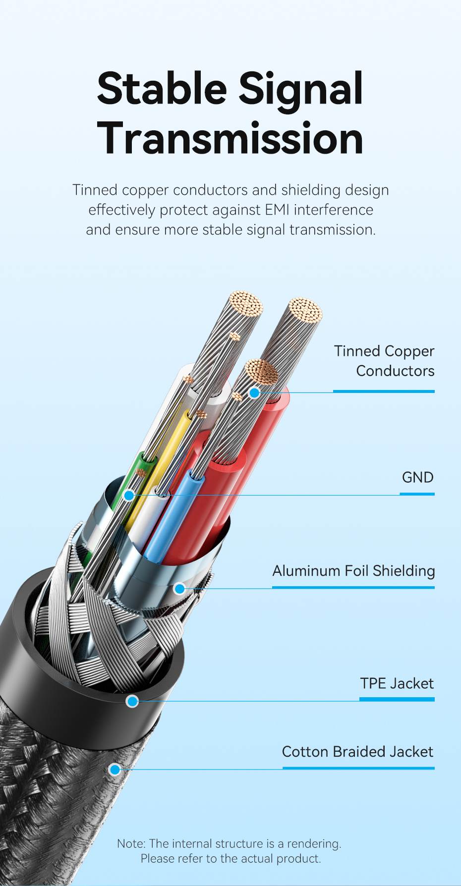 Tinned copper conductors and shielding design effectively protect against EMI interference and ensure more stable signal transmission.