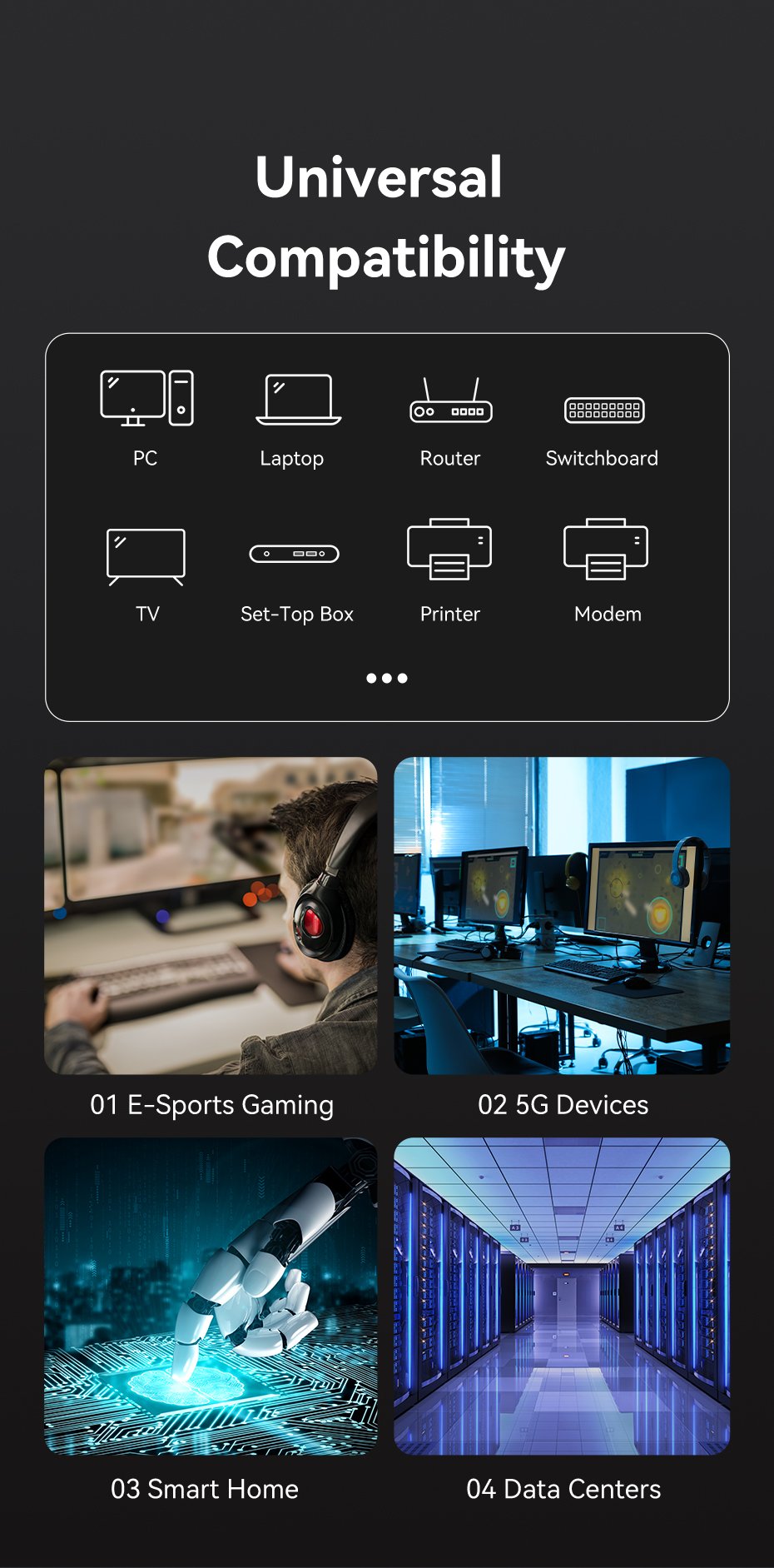 Cáp Cat8 SFTP tương thích với nhiều thiết bị sử dụng cáp mạng Cat 7, Cat 6a, Cat 6, Cat 5 và Cat 5e.