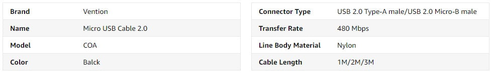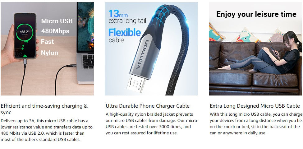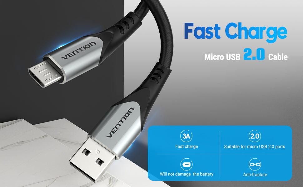 Tính năng Cáp Sạc Nhanh USB Micro USB Male VENTION COA (3A, Aluminum Alloy Type, Cotton Braided)