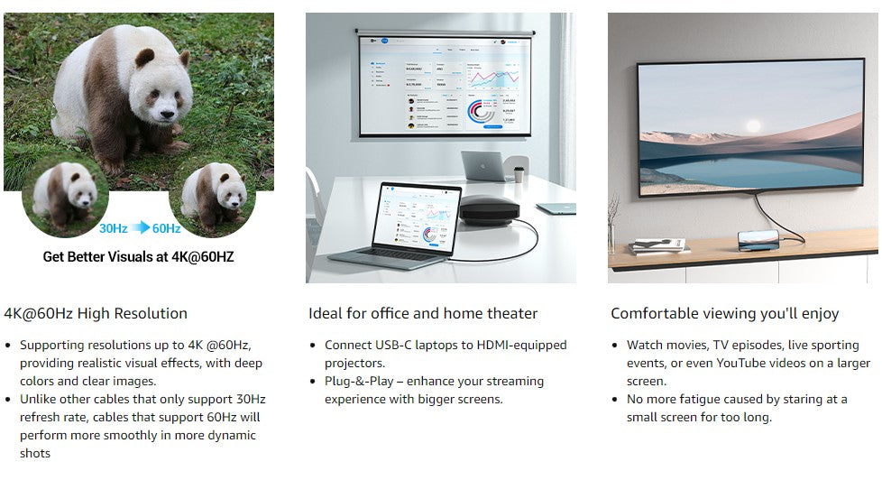 Cáp USB-C to 4K HDMI của chúng tôi cho phép truyền tải hình ảnh với độ phân giải 4K@60Hz, mang đến cho bạn trải nghiệm xem phim, chơi game và làm việc trên màn hình lớn với độ chi tiết tuyệt vời.
