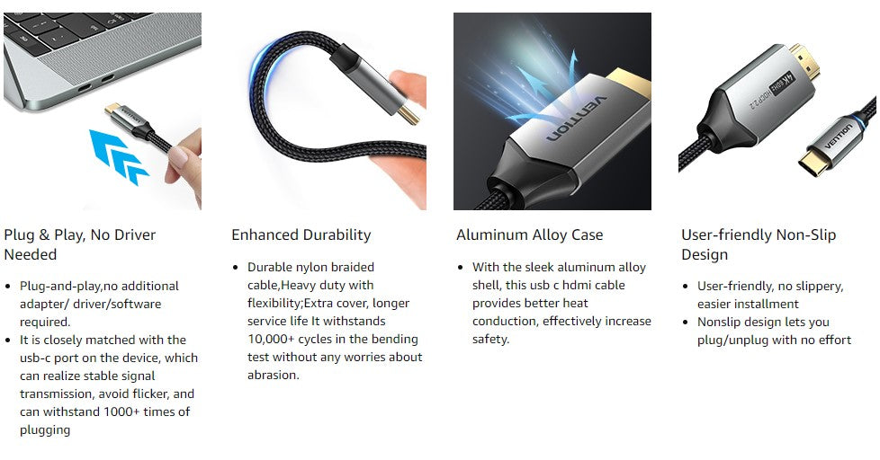 Tính năng Cáp Chuyển Type-C to HDMI 4K VENTION CRBBH (4K@60Hz, Cotton Braided, HDCP2.2)