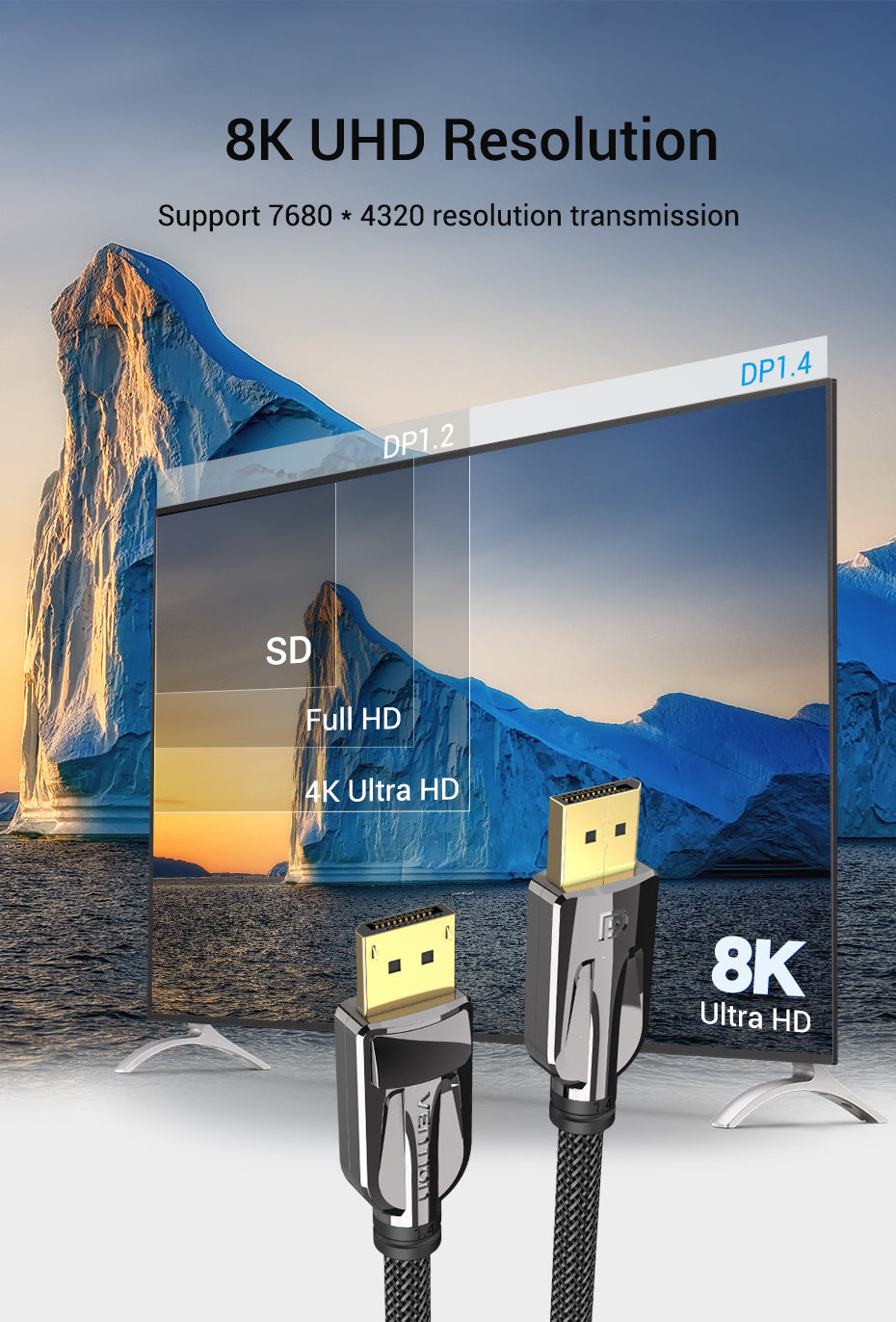 Giới thiệu Cáp DisplayPort1.4 8K VENTION HCA (8K@60Hz, 32.4Gbps, Dynamic HDR, 32-bit Audio Channel, Support 3D)
