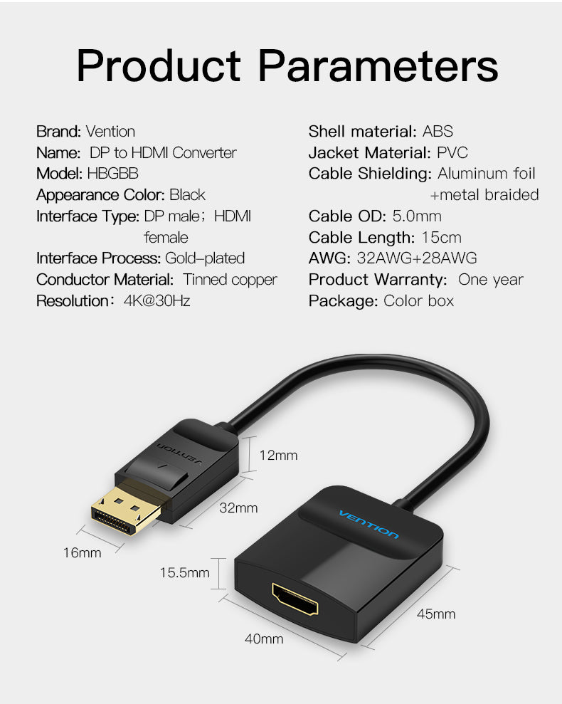 • Tên tiếng Việt: Đầu Chuyển DP to HDMI VENTION HBG (4K@30Hz)