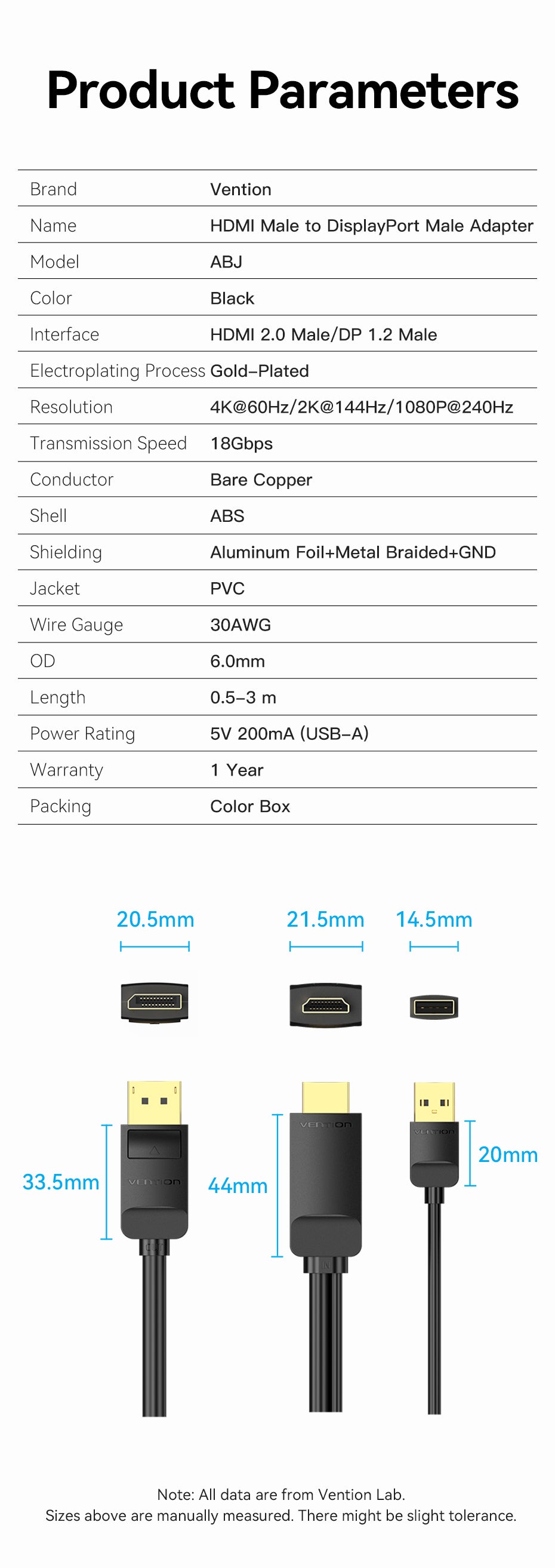 Giới thiệu Cáp Chuyển HDMI to DisplayPort 4K VENTION ABJ (4K@60Hz, 18Gbps, With USB Power Port)