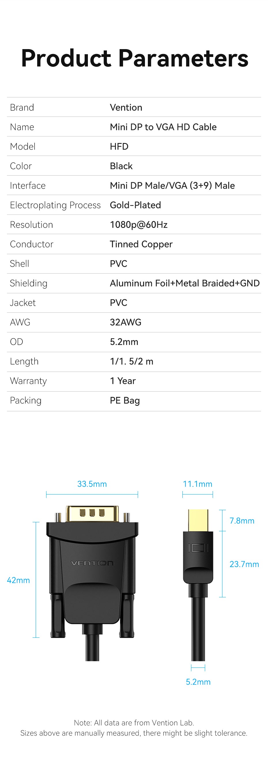 Vention Mini DP Male to VGA Male HD Cable 1M Black ( HFDBF )