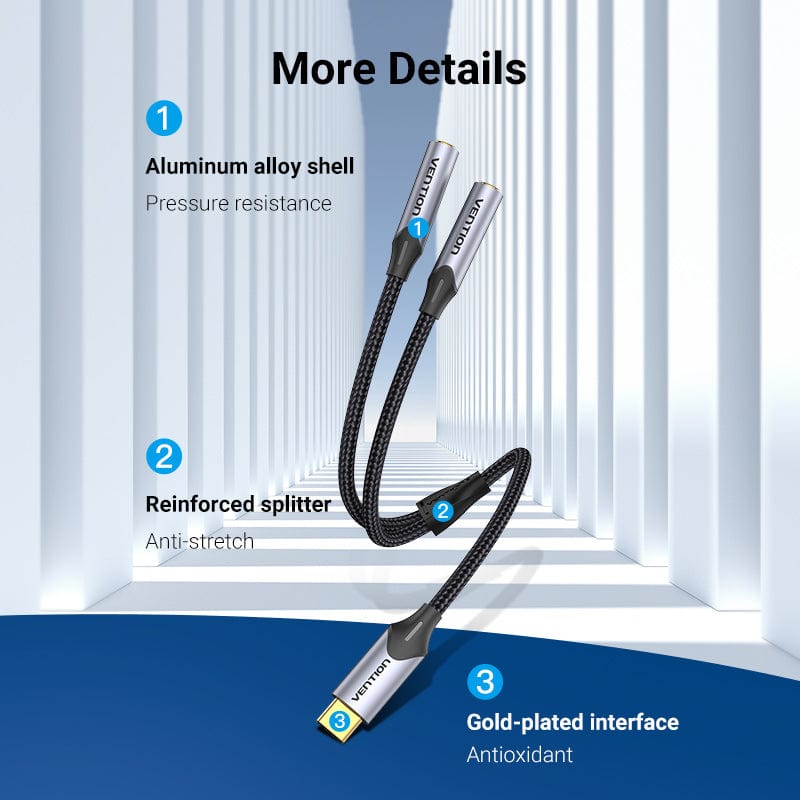 Jack Chuyển Âm Thanh Type C to 2*3.5mm VENTION BGN được thiết kế để chuyển đổi cổng USB-C thành hai cổng âm thanh 3.5mm. Điều này cho phép bạn cùng lúc sử dụng hai tai nghe hoặc loa ngoài với các thiết bị của mình. Bạn có thể dễ dàng chia sẻ âm nhạc, xem phim hoặc thậm chí tham gia vào các cuộc họp trực tuyến với âm thanh chất lượng cao.