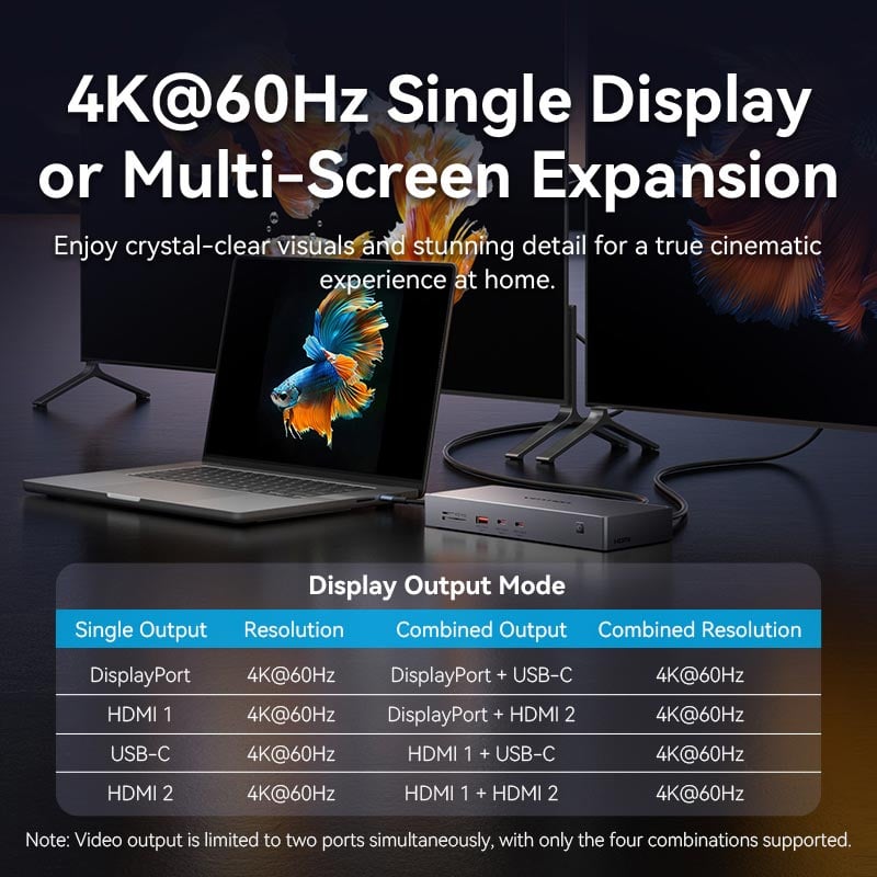 Hub cung cấp 2 nhóm cổng xuất video, cho phép bạn tùy chọn kết nối linh hoạt, cả hai đều hỗ trợ độ phân giải cao 4K@60Hz: