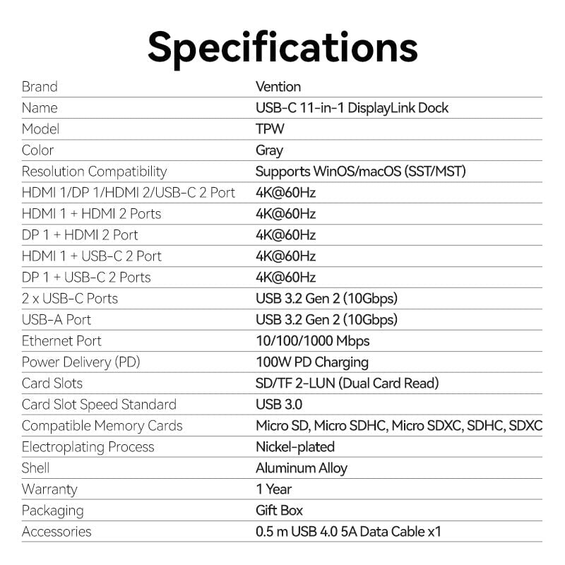 Tính năng HUB Chuyển Đổi Đa Năng 11-in-1 VENTION TPW (Type-C to RJ45 1Gbps + 1*TF/SD + 1*USB-C Host + 1*Type-C PD100W + 1*USB-C/1*HDMI2 4K@60Hz + USB-A 3.2 Gen2 10Gbps + 2*Type-C 3.2 Gen2 10Gbps + DP or HDMI1 4K@60Hz, DisplayLink, Compatible with Windows/MacOS)