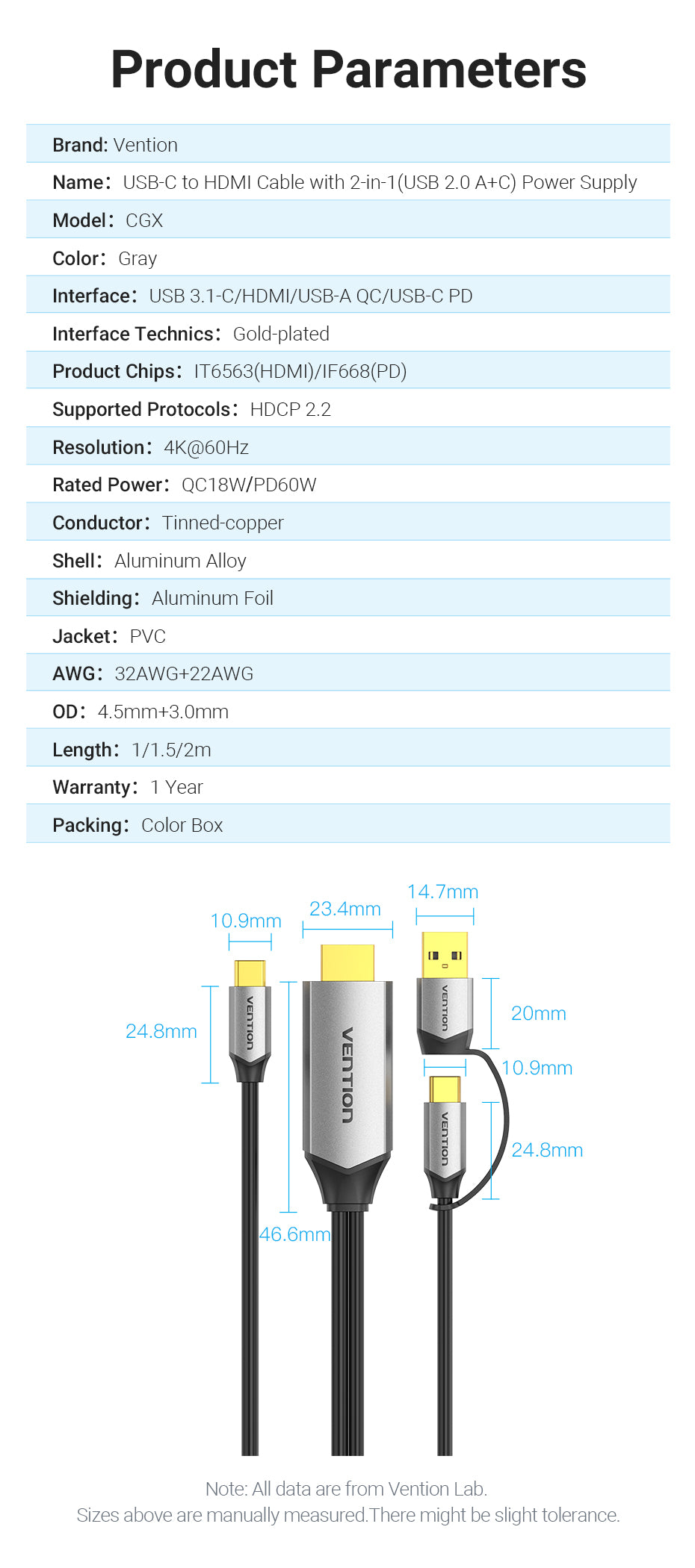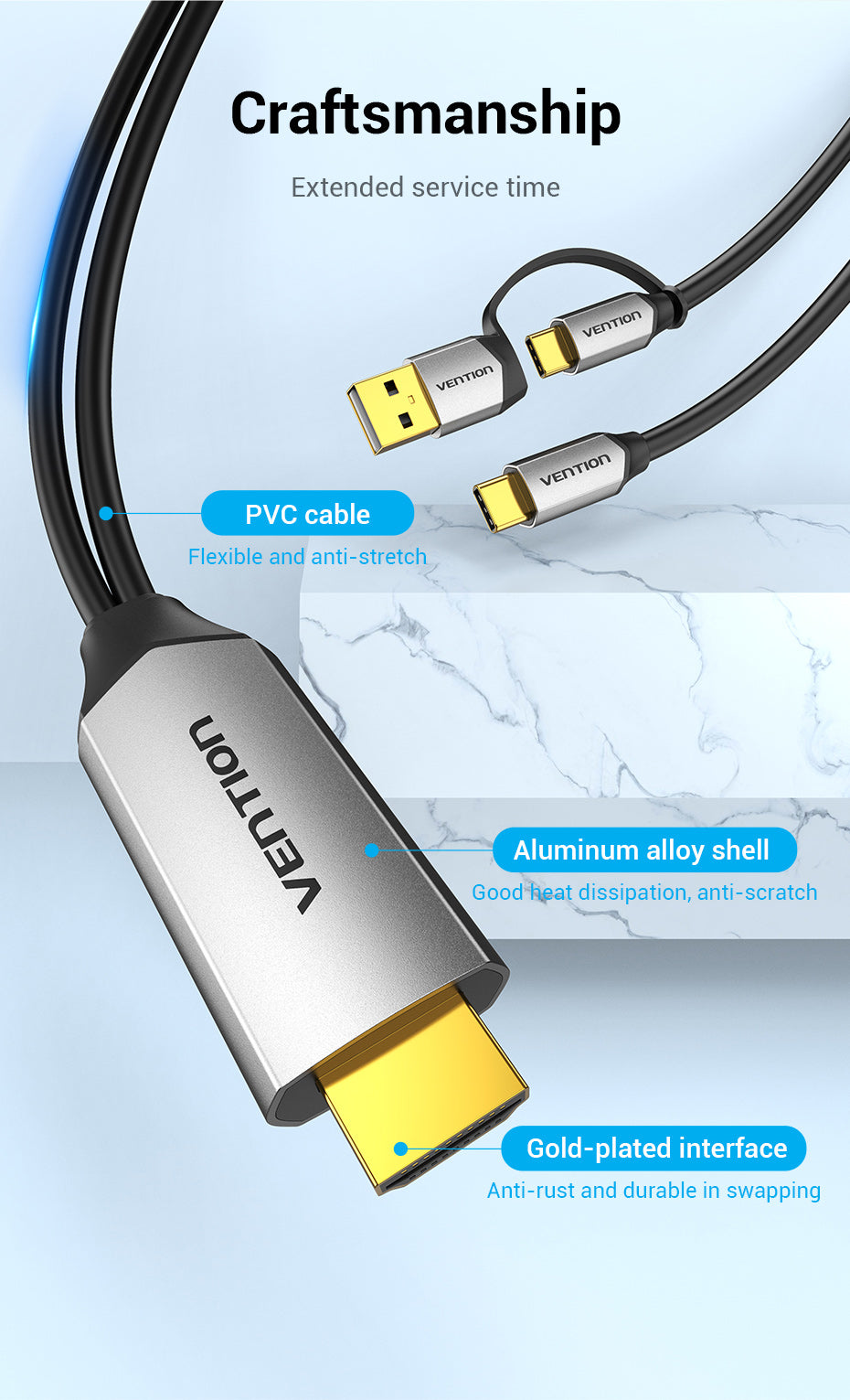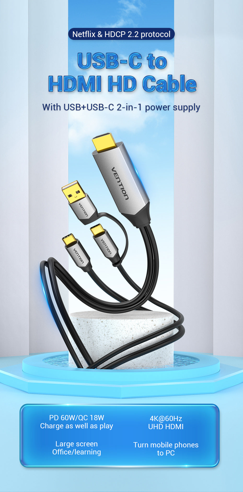 Name: USB-C to HDMI Cable with 2-in-1(USB 2.0 A+C) Power Supply