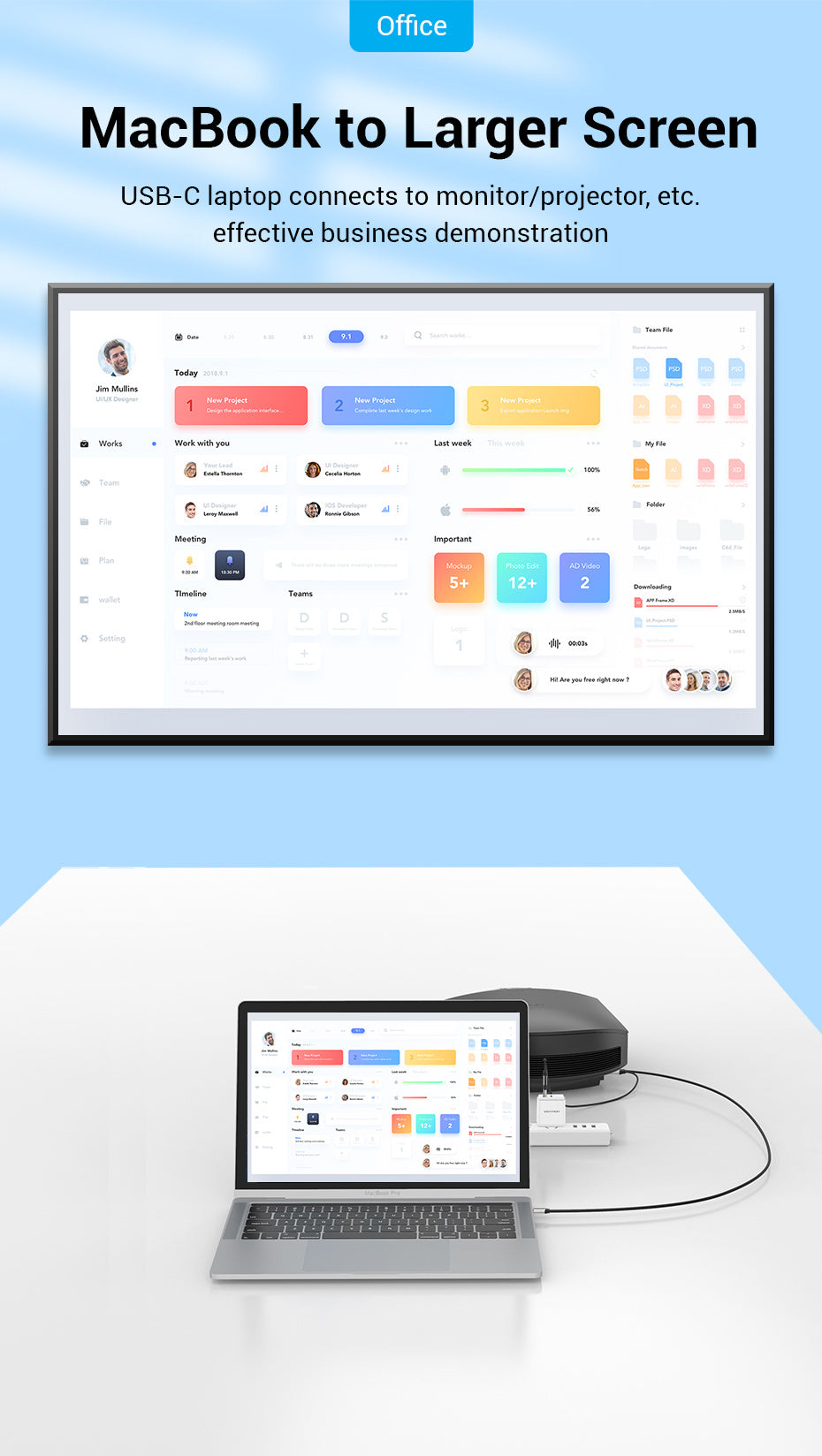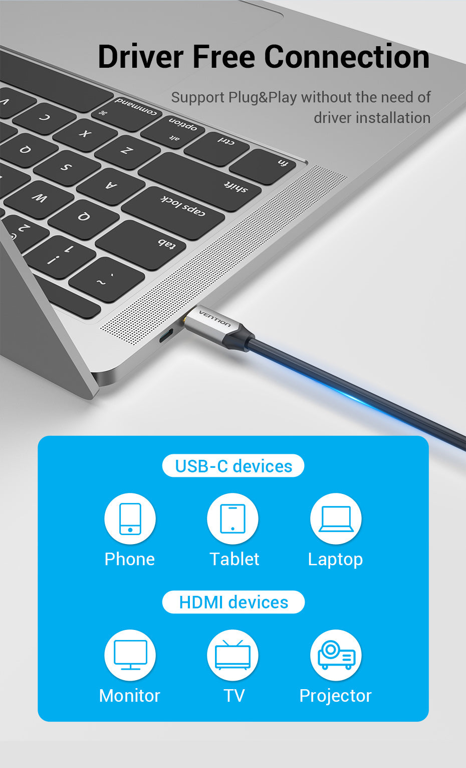 USB-C laptop connects to monitor/projector, etc.